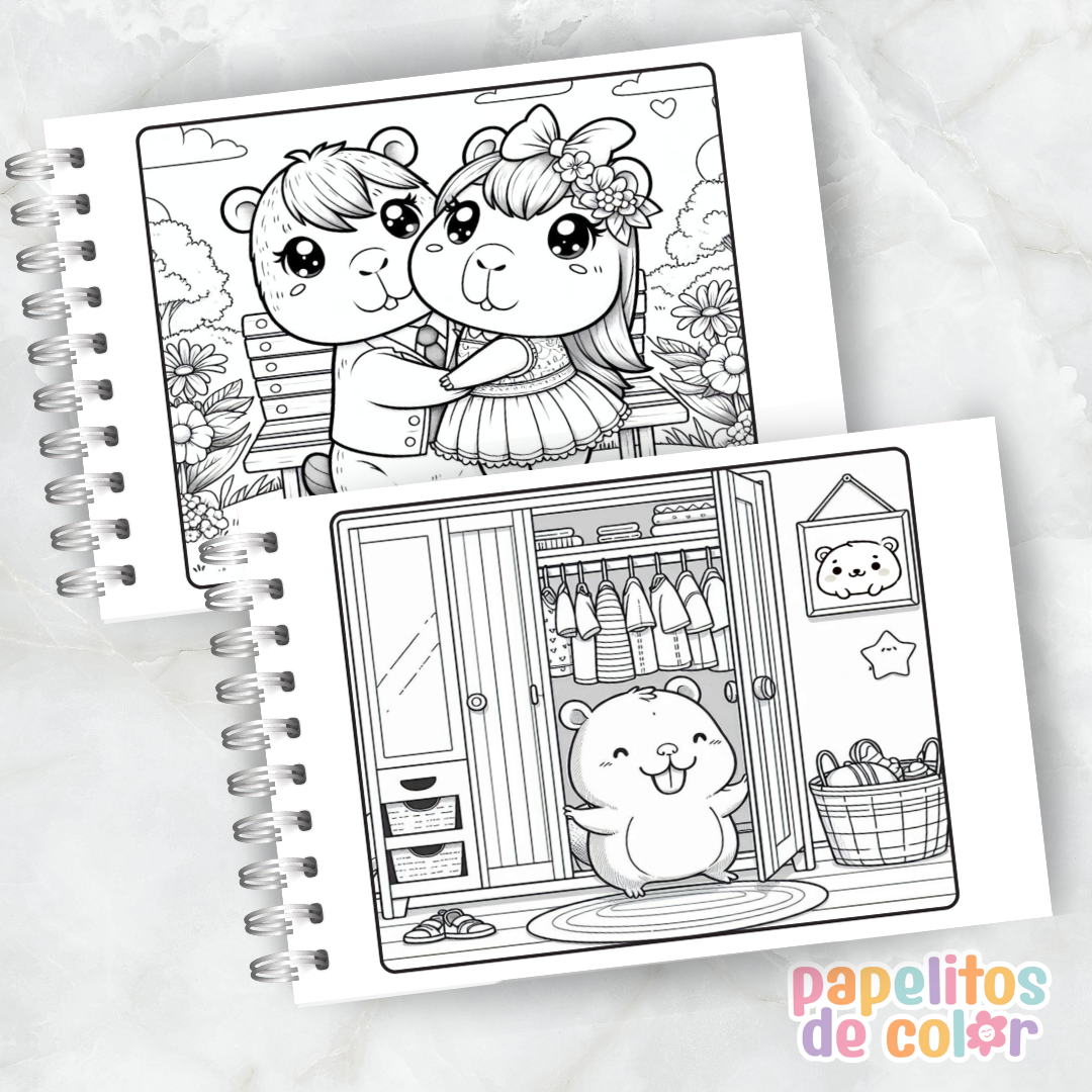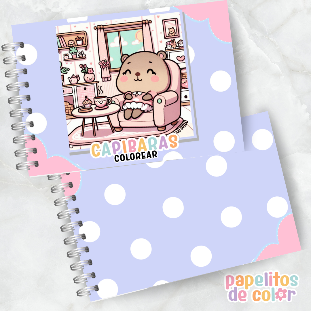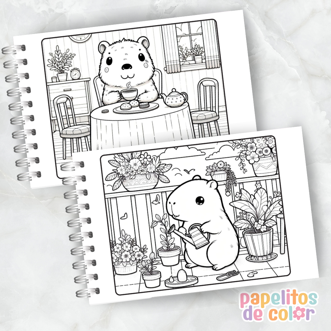 Disfrutá este adorable libro para pintar de capibaras 🖍️💖. En formato A5 apaisado, incluye 52 hojas con ilustraciones relajantes y divertidas listas para colorear.