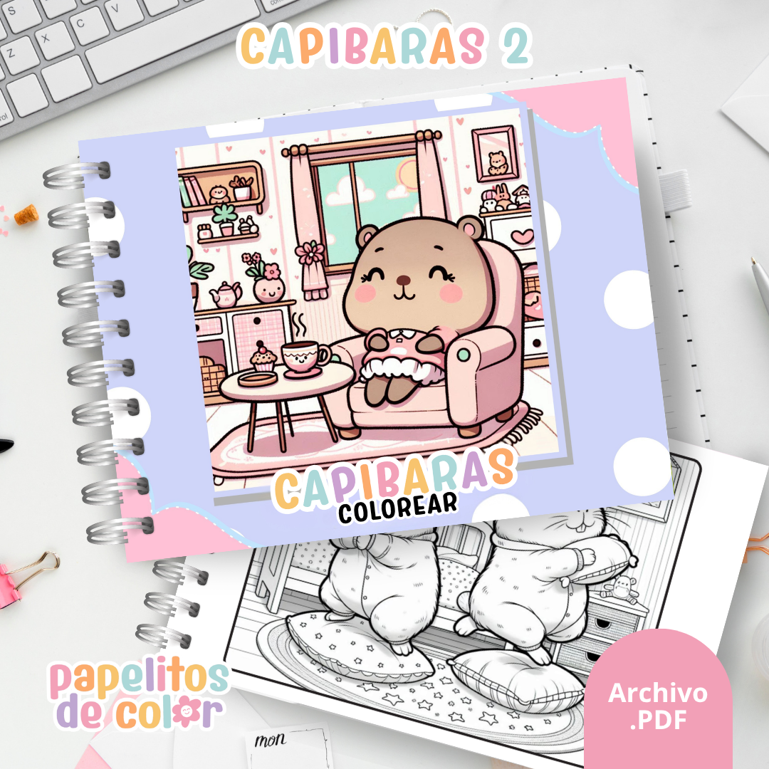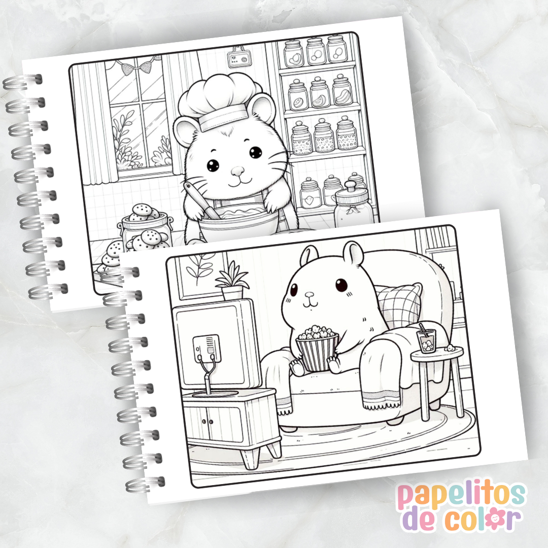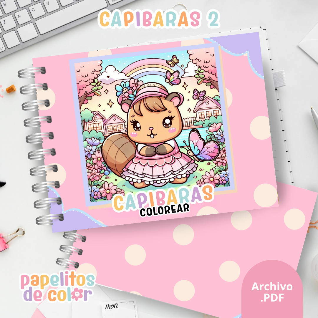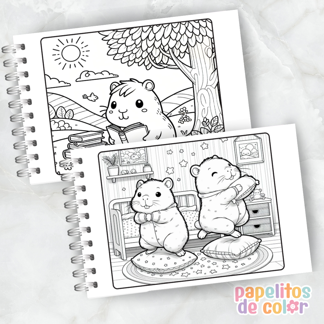 Disfrutá este adorable libro para pintar de capibaras 🖍️💖. En formato A5 apaisado, incluye 52 hojas con ilustraciones relajantes y divertidas listas para colorear.