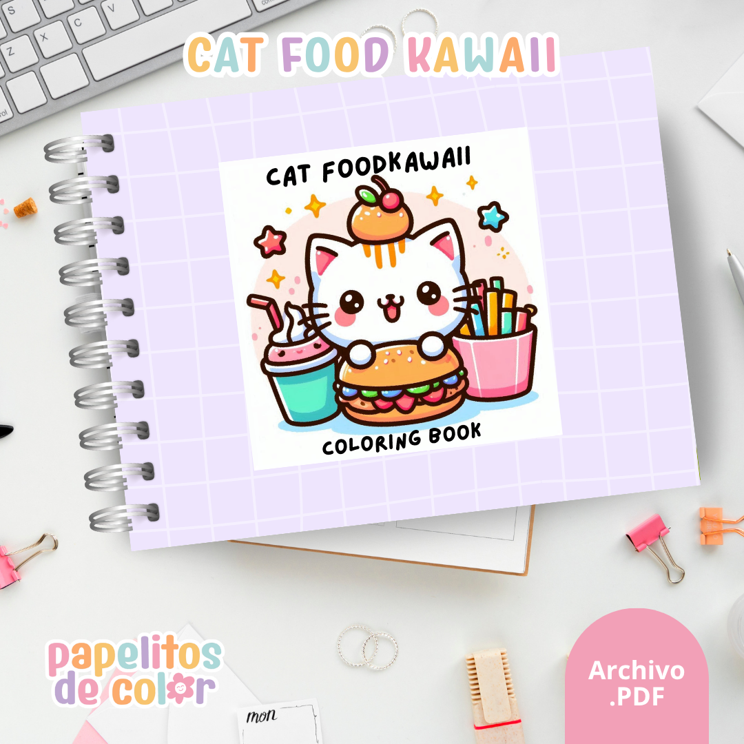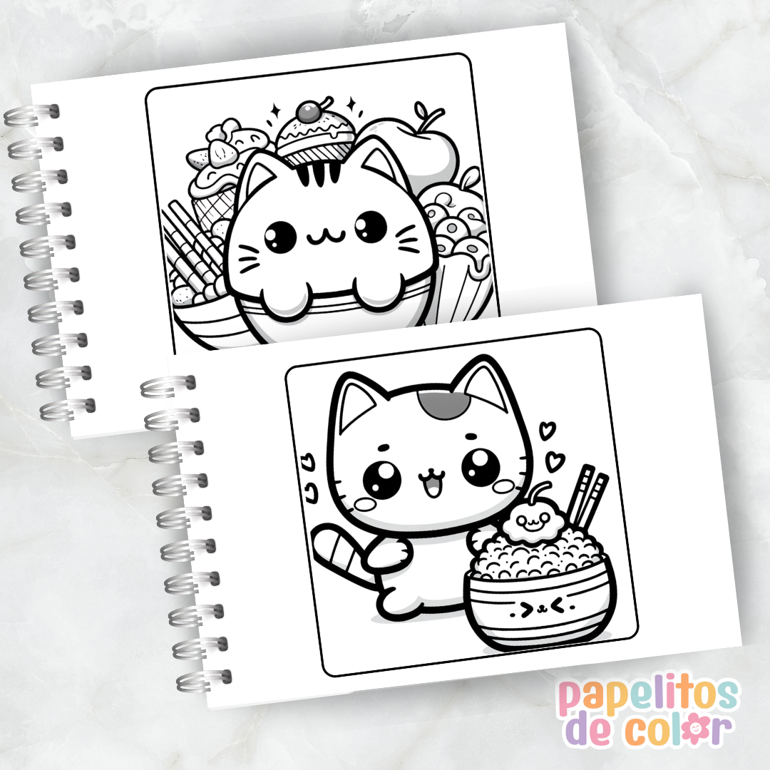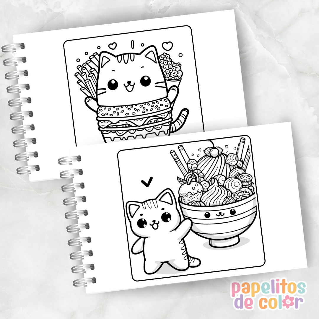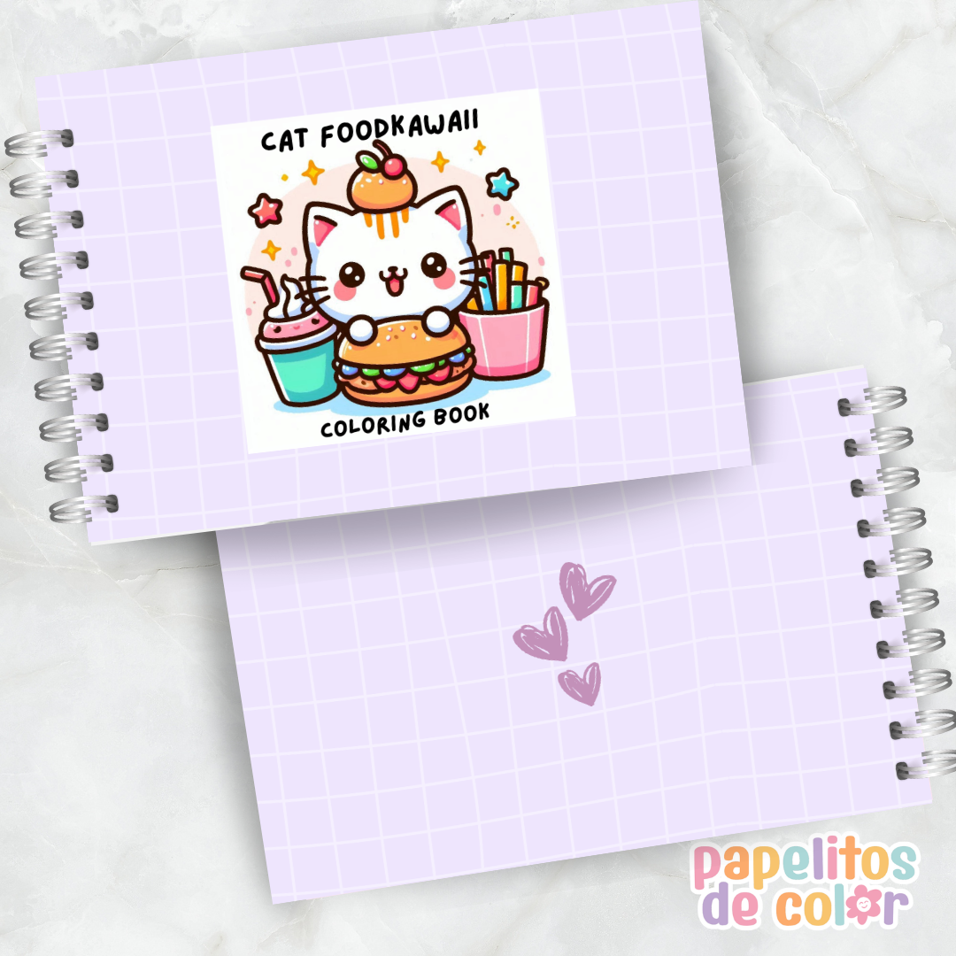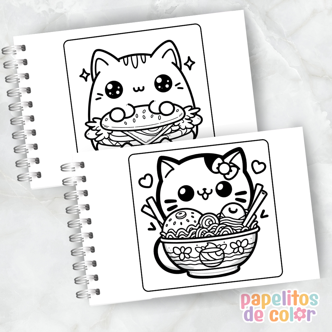 Disfrutá este divertido libro para pintar de Cat Food Kawaii 🖍️💖. En formato A5 apaisado, incluye 60 hojas con ilustraciones adorables y creativas listas para colorear.