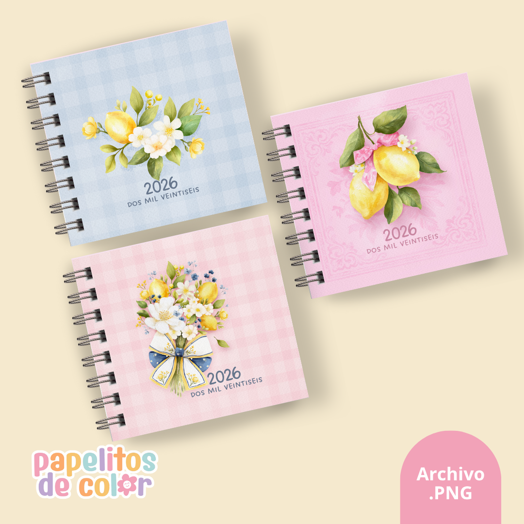 Diseños en colores pasteles combinados con ilustraciones de limones 🍋✨, que transmiten frescura, alegría y delicadeza. Perfectas para darle un aire romántico y femenino a tus agendas 2026.