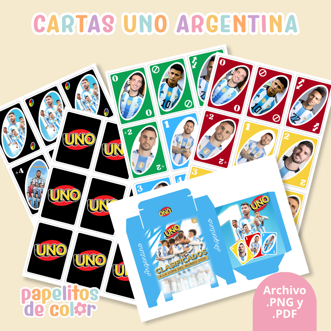 Viví la pasión por la celeste y blanca en cada partida 🩵🤍 Este kit imprimible incluye todas las cartas del juego estilo UNO con un diseño exclusivo inspirado en la Selección Argentina, más la caja contenedora lista para imprimir, recortar y armar ✂️📦