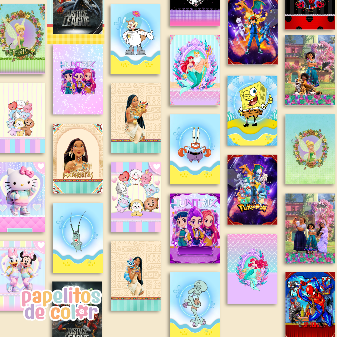 Incluye 39 tapas con sus respectivas contratapas listas para imprimir y usar en tus encuadernaciones. Comprás y lo recibÃs en instantes en tu mail 📩⚡ Diseños prediseñados para que solo agregues nombre o año y las uses tal cual están. Este volumen incluye personajes como Snoopy, Kuromi, Pokémon, Pocahontas, Encanto, Hello Kitty, BTS, Bob Esponja, La Sirenita, Campanita y estilo guerrera K-pop 💜✨ Perfectas para armar tapas de cuadernos, agendas o planners de forma rápida y profesional.