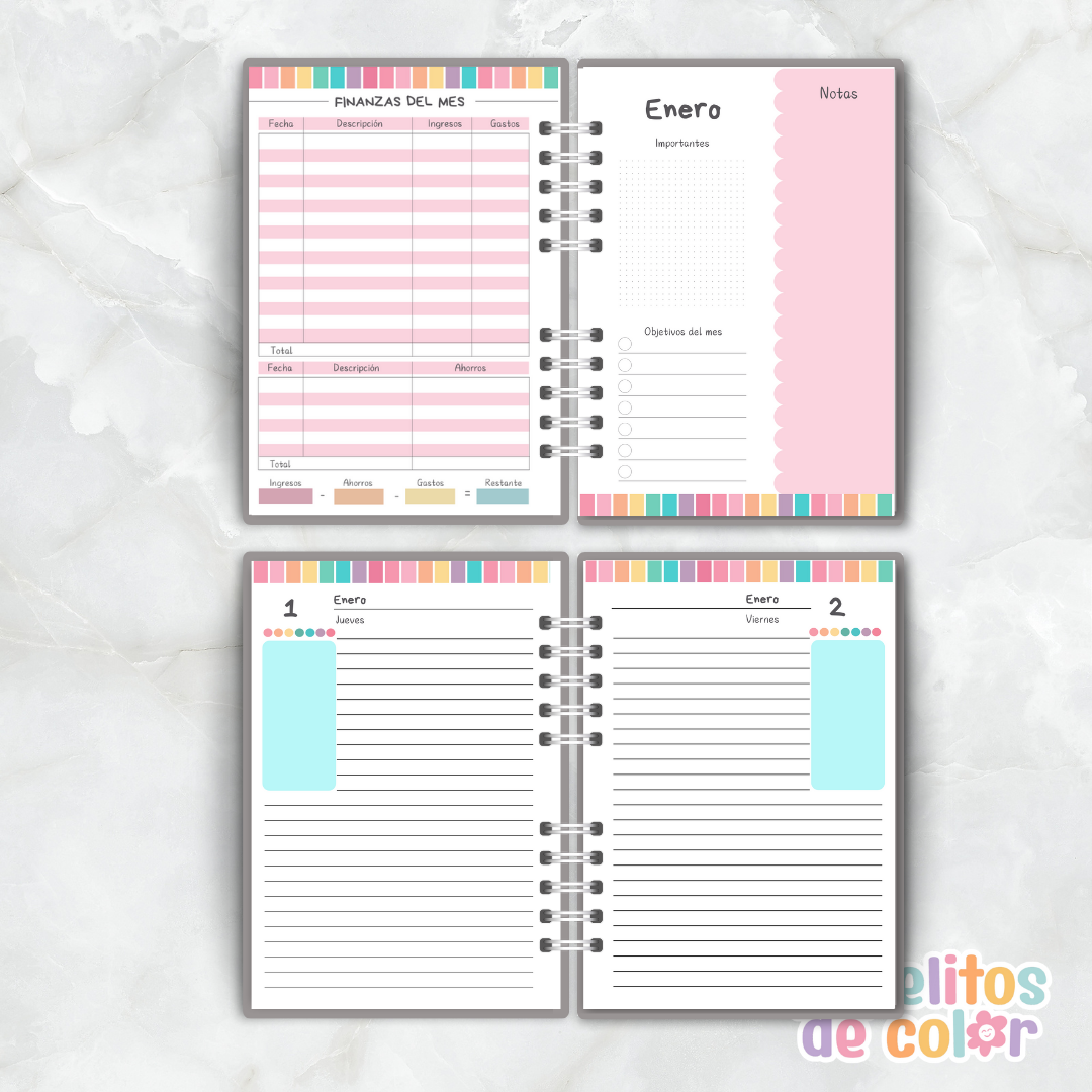 Con su estilo colorido, delicado y práctico, esta agenda se convierte en tu compañera ideal para mantener todo bajo control durante el año.