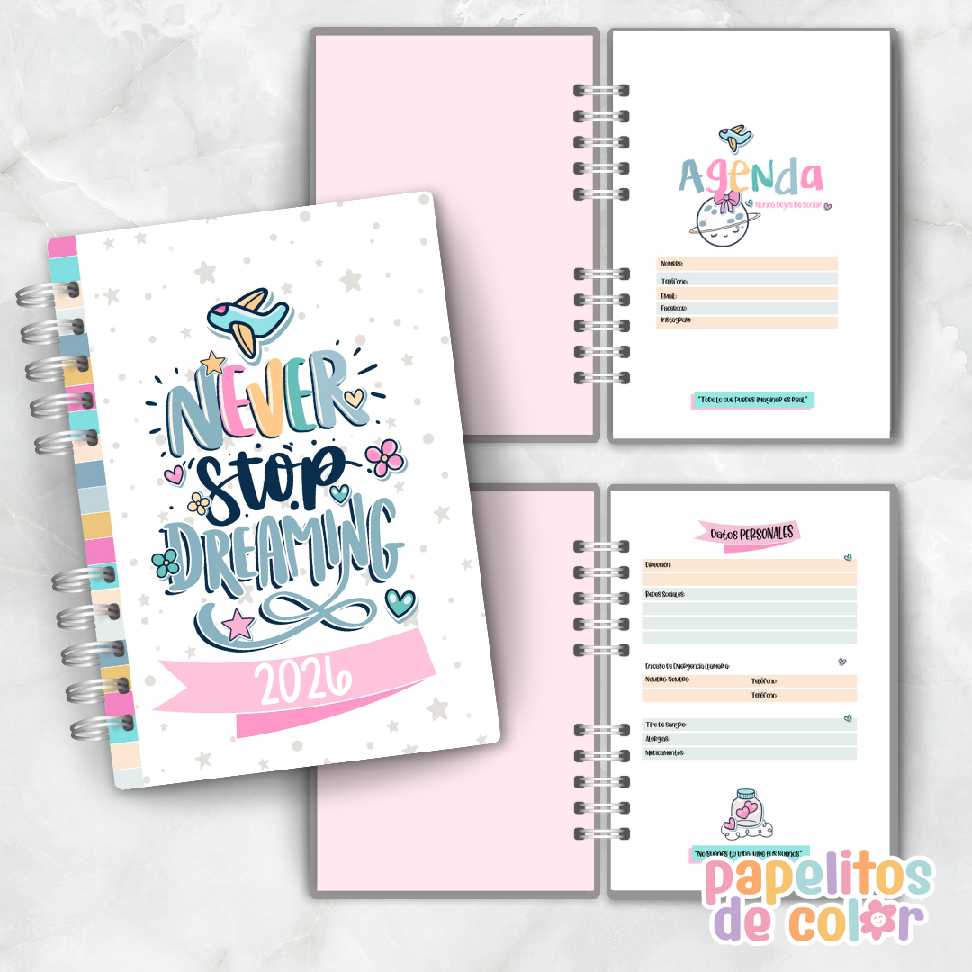 La Agenda Nunca Dejes de Soñar 2026 está diseñada para inspirarte y acompañarte en cada meta, recordándote que los sueños se cumplen si los planificás 🌟. Con un estilo delicado y funcional, es ideal para organizar tu año de forma práctica y motivadora.